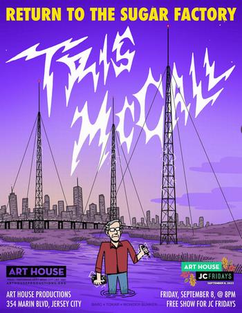 “Return To The Sugar Factory” brings McCall’s story full circle, merging songs like “Dancing To Architecture,” “Machines To Make You Feel Good,” and “Go Back To West New York” with Jersey City’s art scene. The concert was staged in the new Art House Productions building on Marin Boulevard, featured light installations by local artist Frank Ippolito and an integrated slideshow by photographer Dorie Dahlberg, and coincided with a new show in the Art House gallery by Andrea McKenna, an artist McCall has long championed in print.